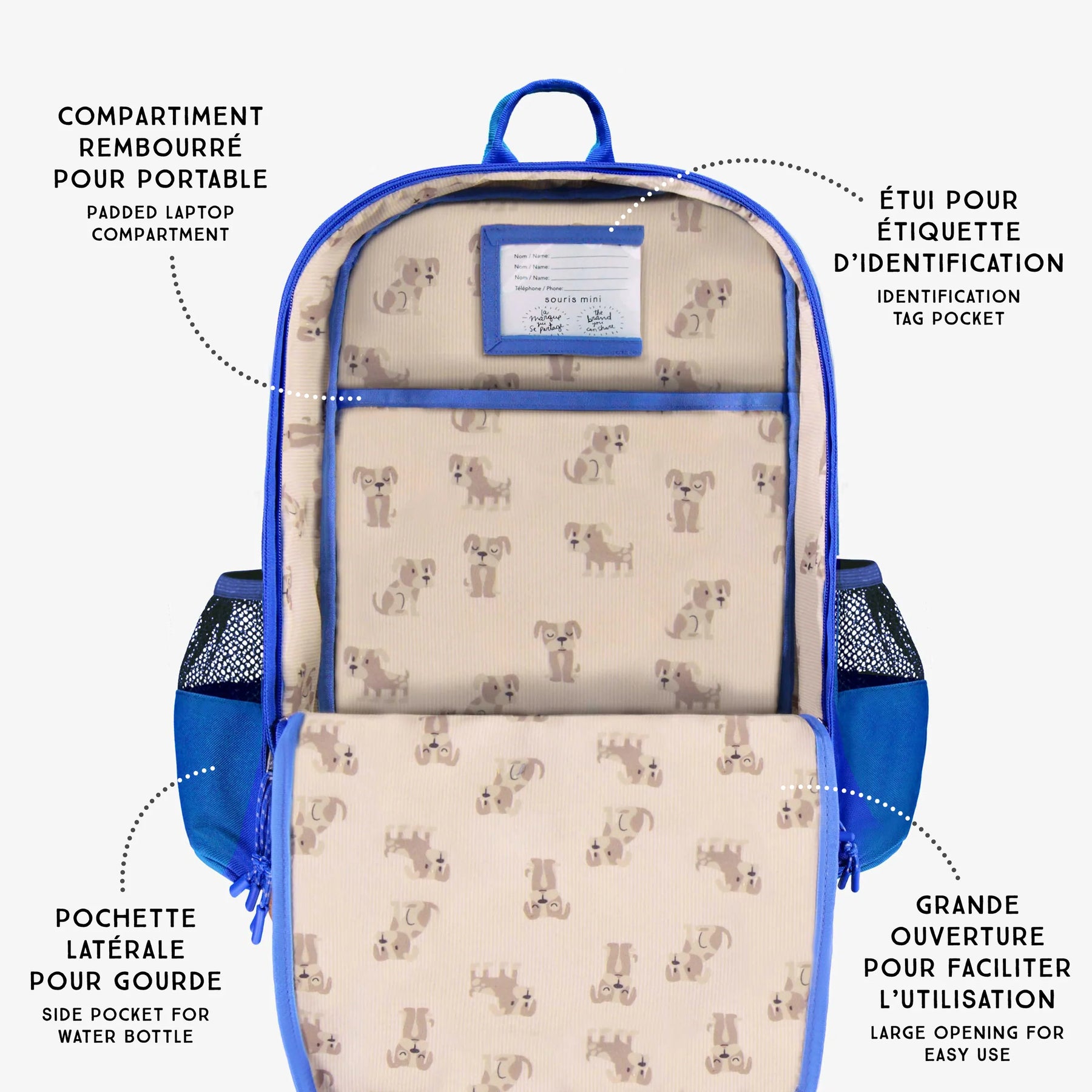 This blue backpack is made from durable, coated fabric to protect against wear, water, and stains. It features adjustable, padded shoulder straps and a chest strap for added comfort. With a wide opening, multiple compartments, and side pockets, it's perfect for carrying essentials. Fun surprise illustrations inside add a playful touch!Coated fabric for protection against wear, water, and stainsAdjustable chest strapAdjustable, padded shoulder strapsSide pocketsMultiple compartmentsReflective strips on the frontCarabiner clipDimensions: 43 cm x 28.5 cm x 16 cm