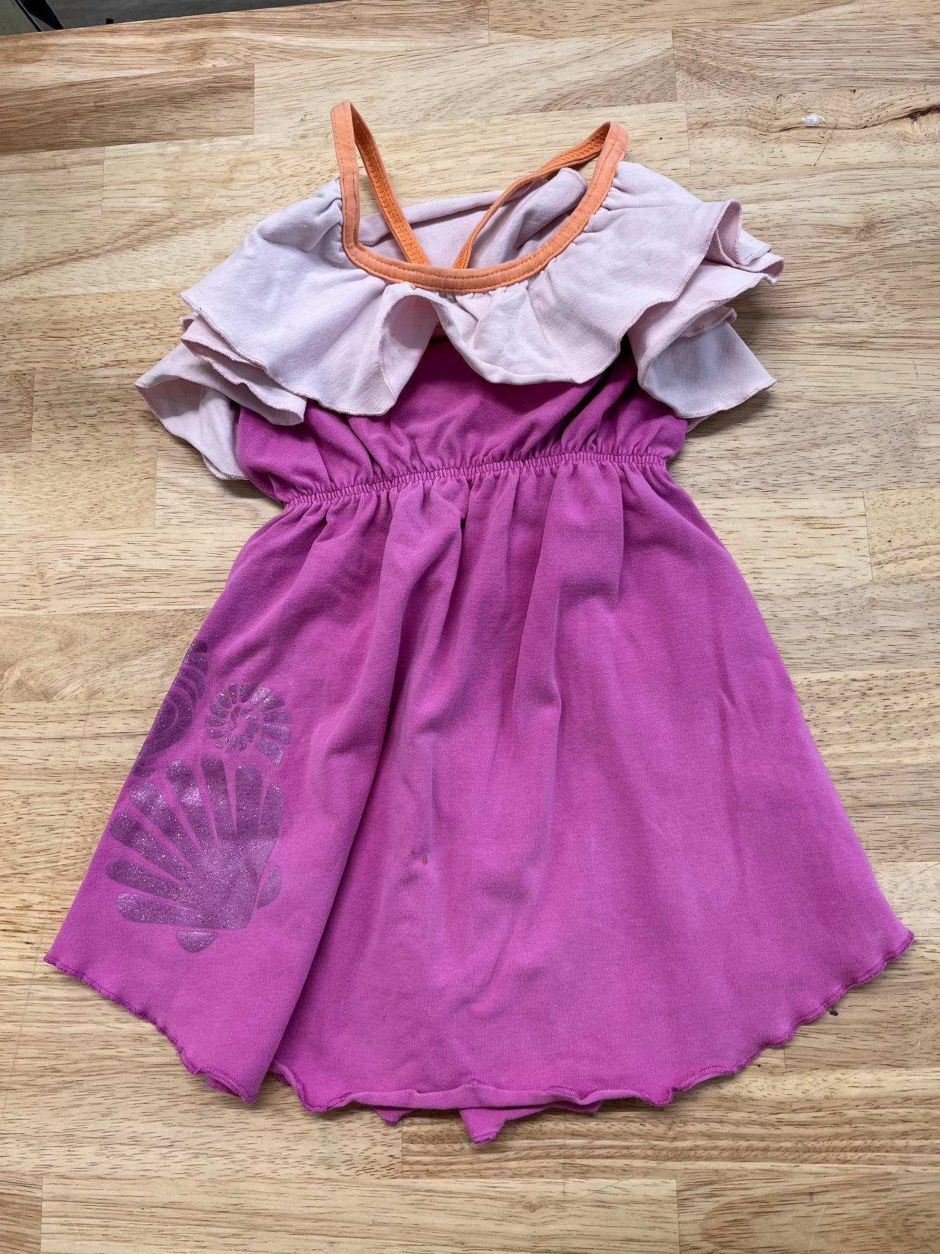 Peekaboo Beans summer dress in purple with pink frill, size 2. Good used condition.