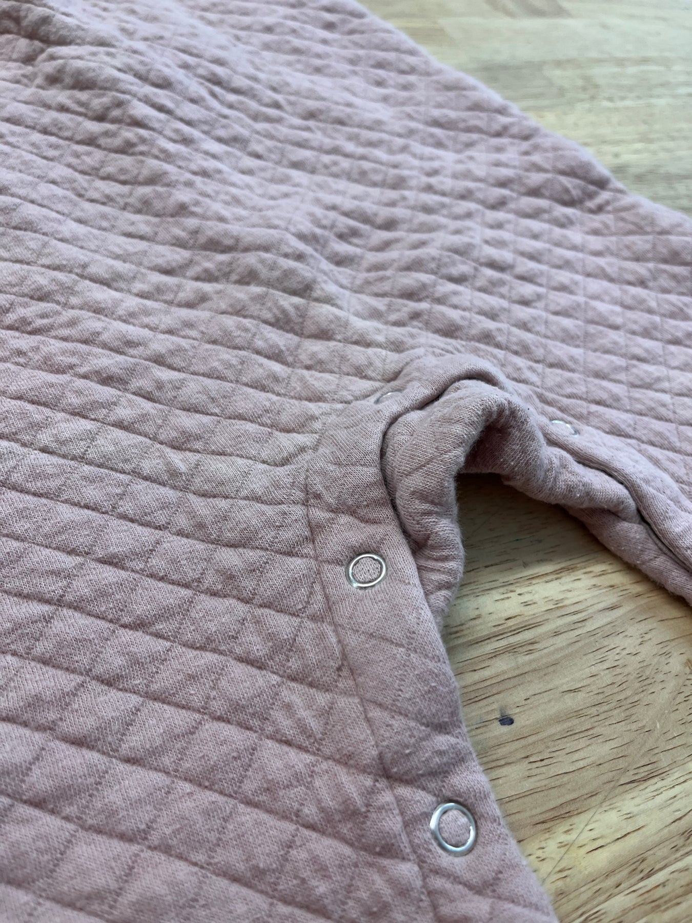Pehr quilted romper, light pink, size 6–12 months, fair condition with light pilling throughout.