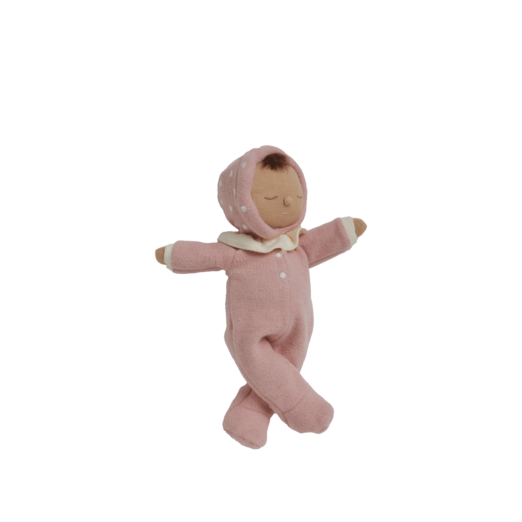 Blushing pink and full of charm, Toadstool Pip is a pocket-sized daydream dressed for woodland whimsy. With a pastel mushroom-cap hood, delicate embroidered spots, and a ruffled collar for extra enchantment, Pip is ready for all the softest snuggles.