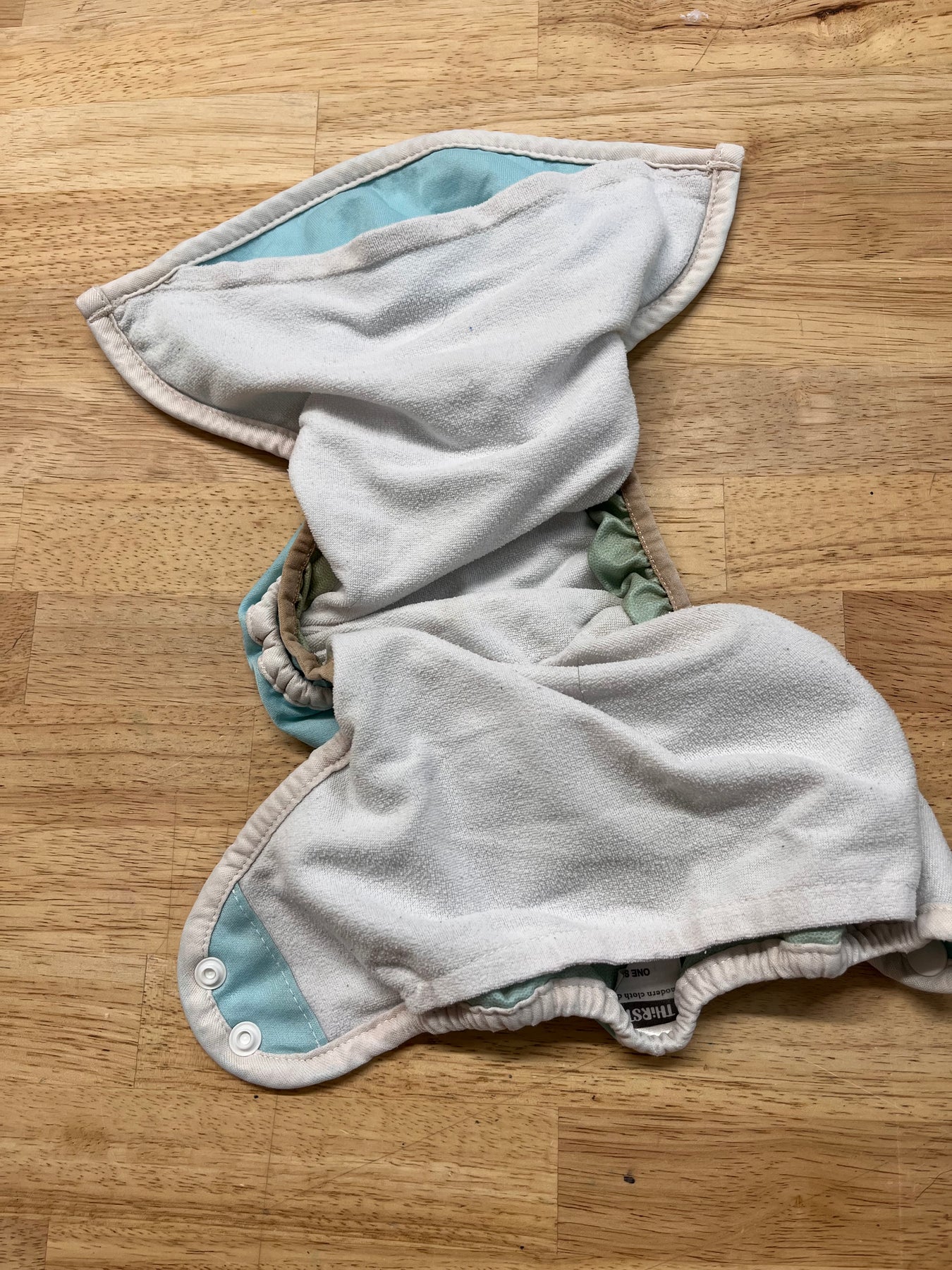 Thirsties Pocket Diaper in fair condition. Light blue printed exterior, double gusset, moderate wear.
