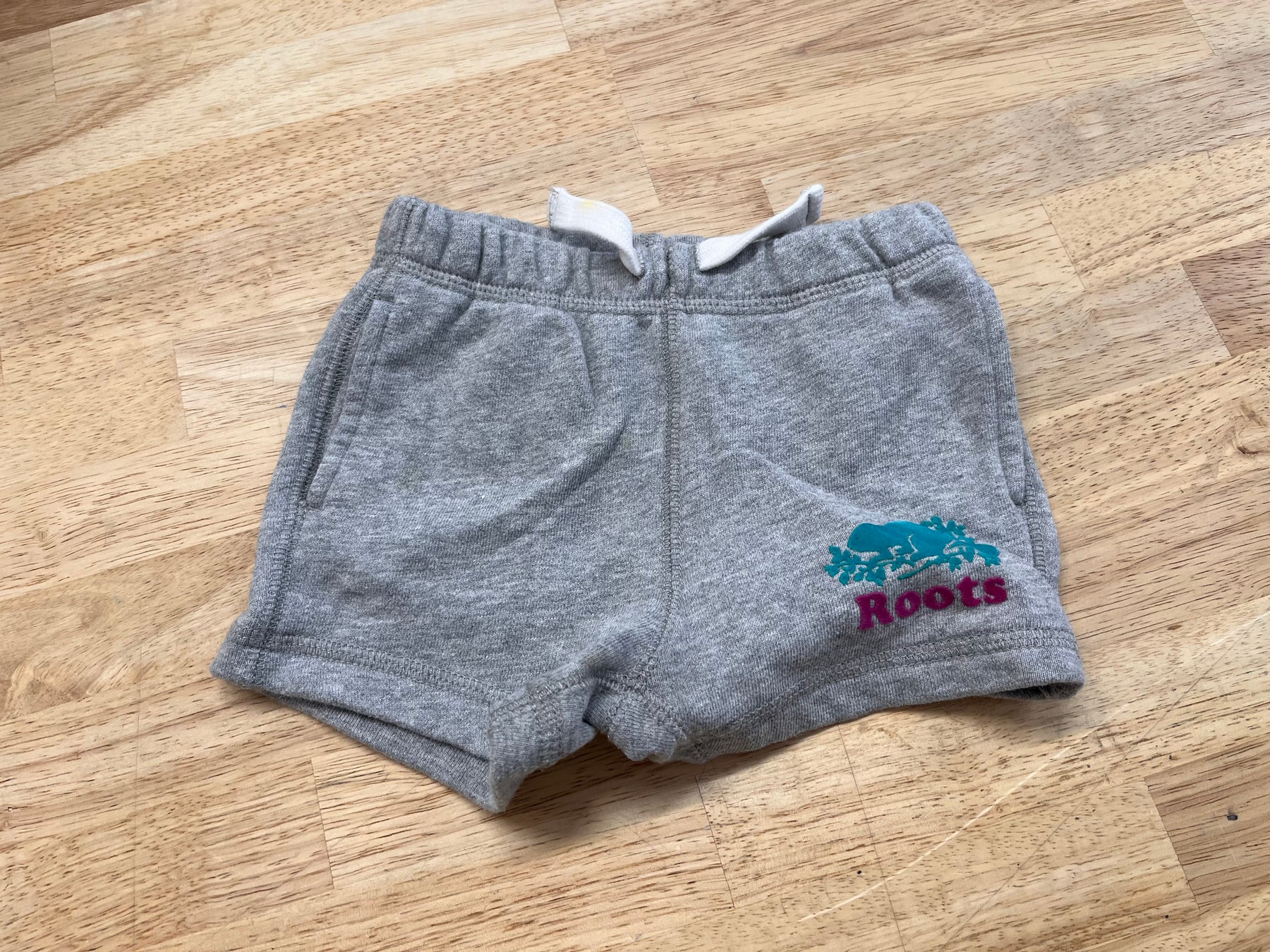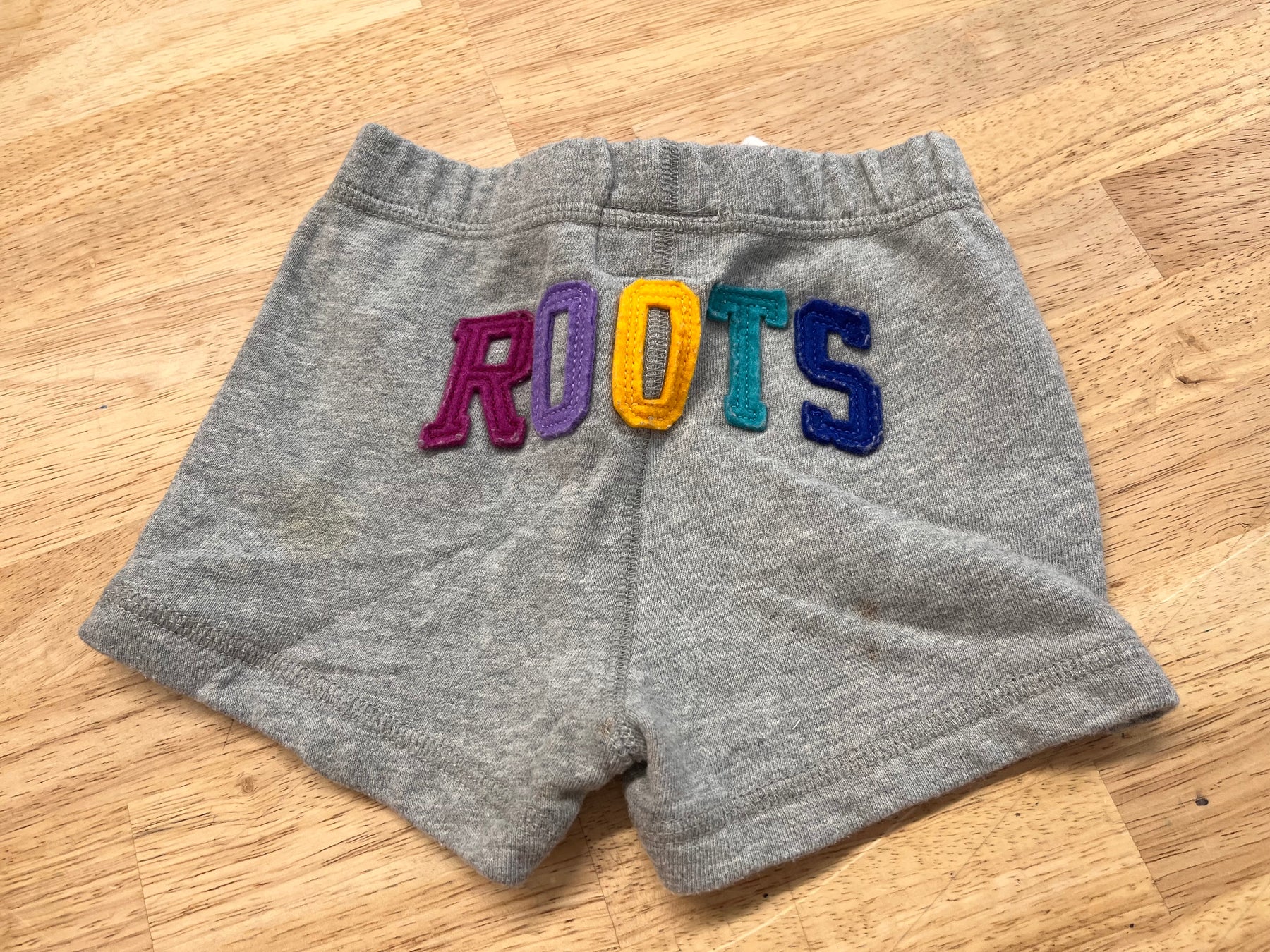 Knit jersey shorts with “Roots” on bum; light yellow staining on faux drawstring tie; good used condition.