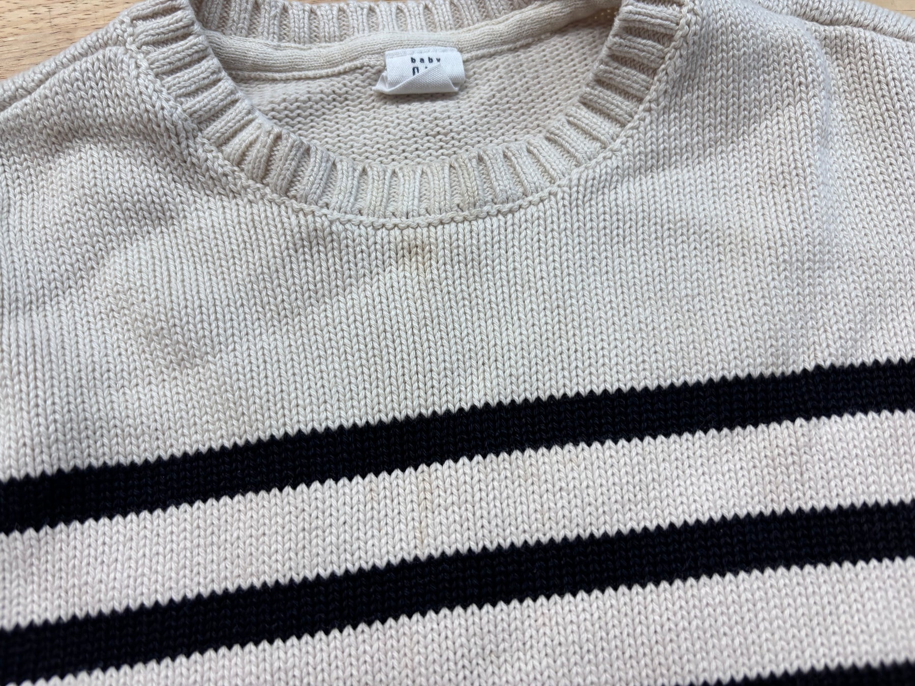 Cream sweater with black stripes. Small stain under chin at collar; otherwise fair used condition.