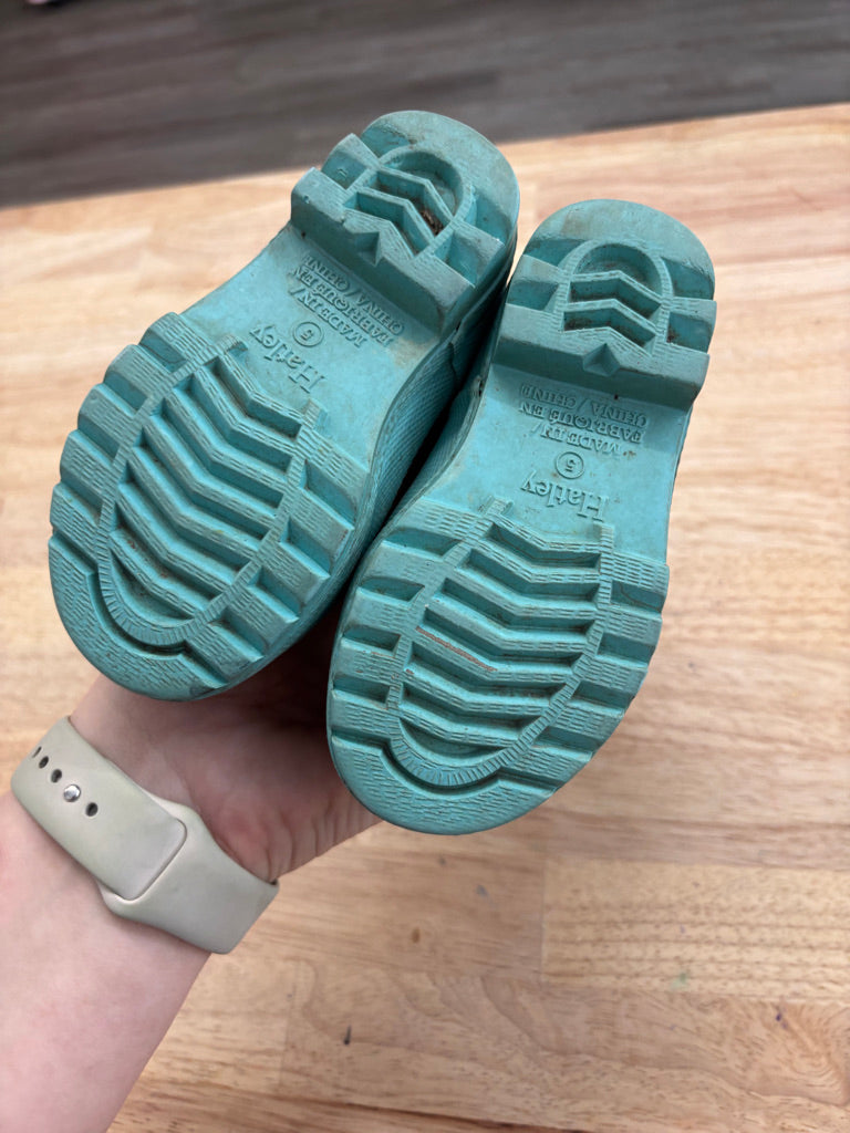 Hatley size 5 rain boots with pink stripes. Inside lining beginning to peel. Fair condition.