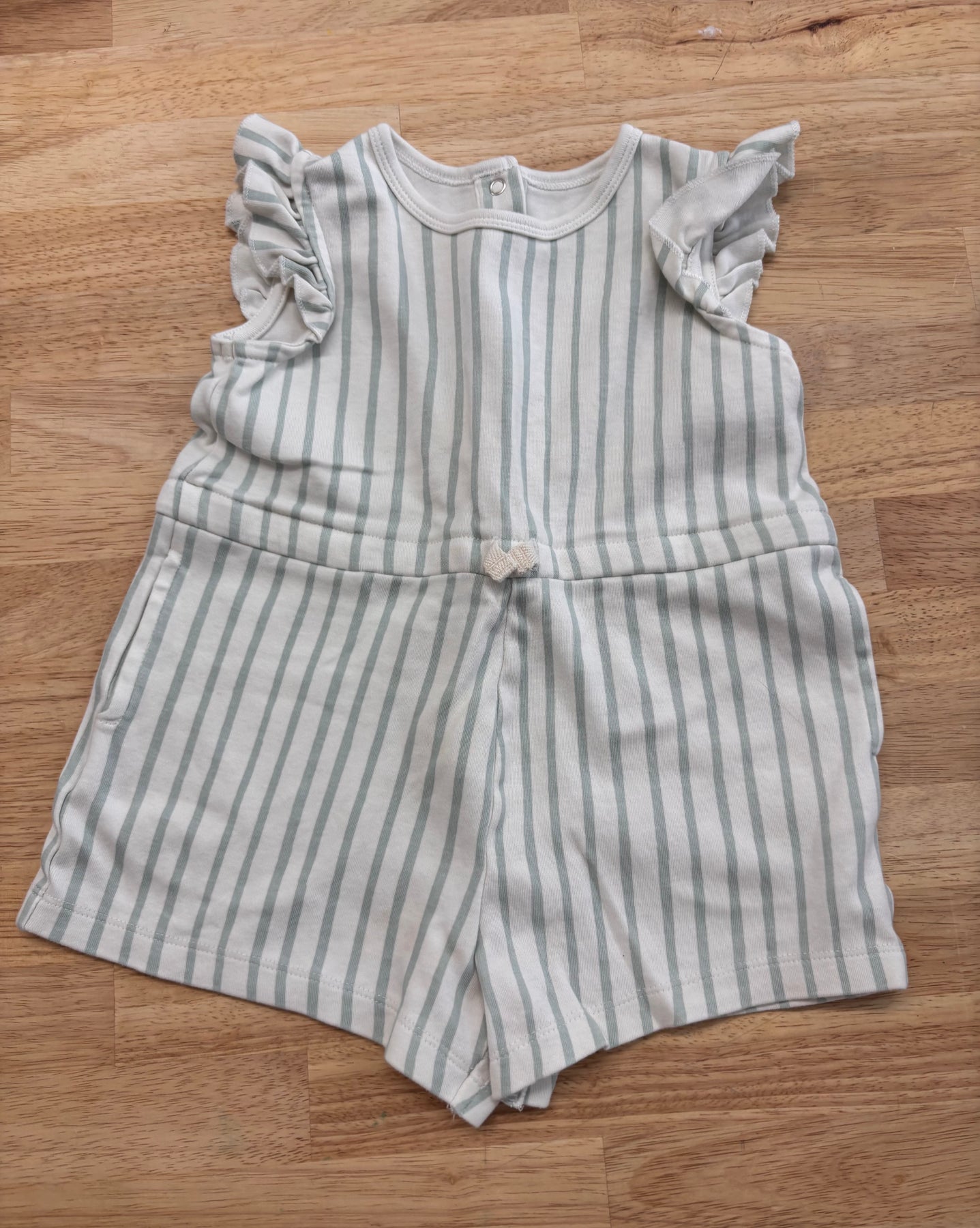 Pehr romper, 100% organic cotton pinstripe shortall, size 12–24 months, like new with minimal wear.