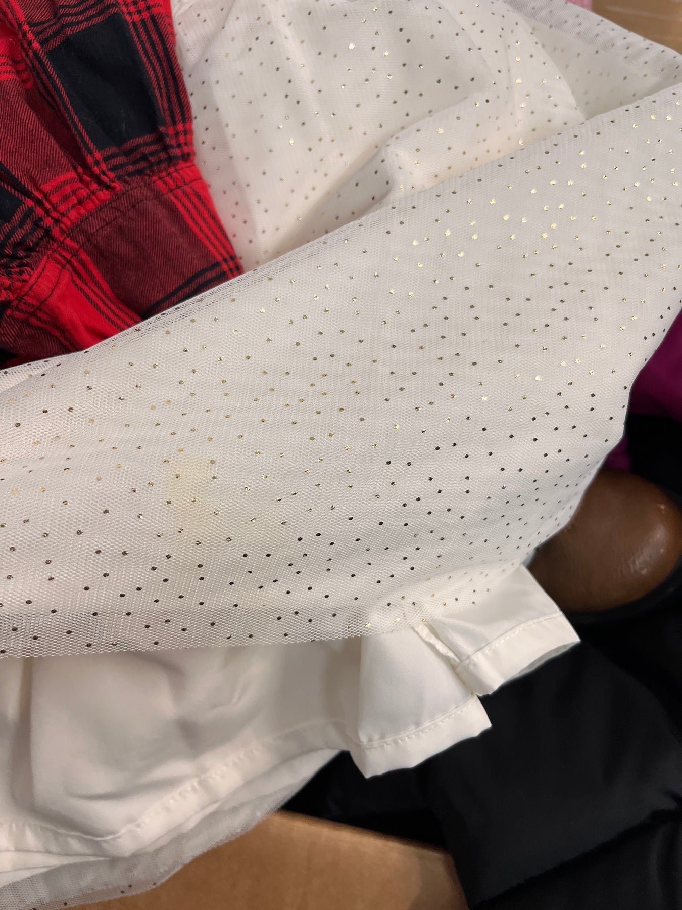 Carter’s cream dress with gold polka dot tulle skirt. Size 24 months. Like new condition with faint yellow stain on front (minimal, hard to spot).