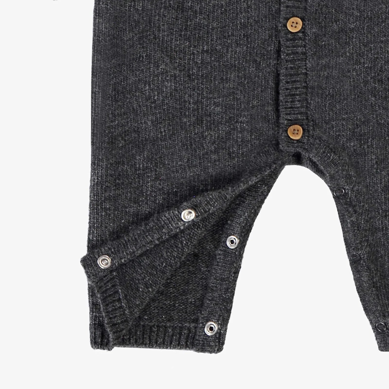 This cozy gray knit one-piece features winter-inspired jacquard patterns and faux wood buttons at the front. Snap buttons at the legs and crotch make dressing easy. Ribbed knit details at the neckline, cuffs, and ankles provide a snug fit.