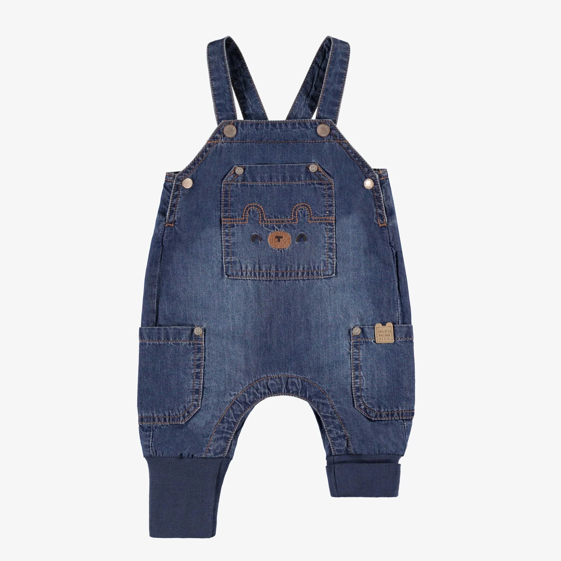 Comfortable and stylish, it features a large front pocket with bear embroidery and two side pockets for added charm. Adjustable straps ensure a perfect fit, while ribbed knit cuffs adapt to your baby's growth. Snap buttons at the crotch make dressing easier.Wide fitLightweight denimAdjustable strapsSnap buttonsRibbed knit