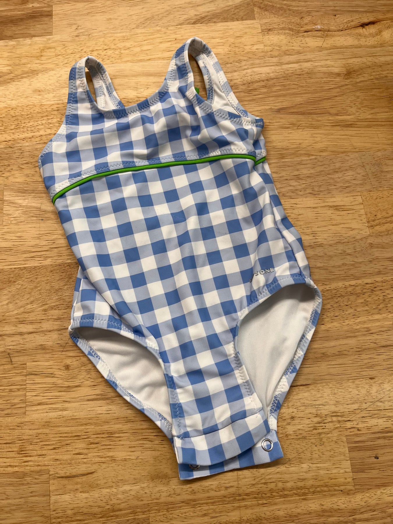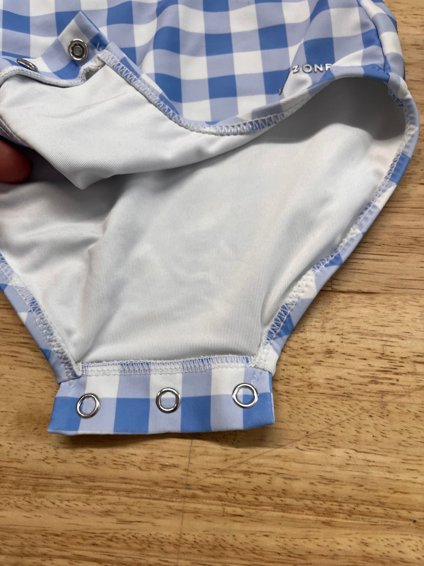 Ripzone one-piece swimsuit in gingham plaid print with snap crotch. Size 12–18 months. Good used condition.