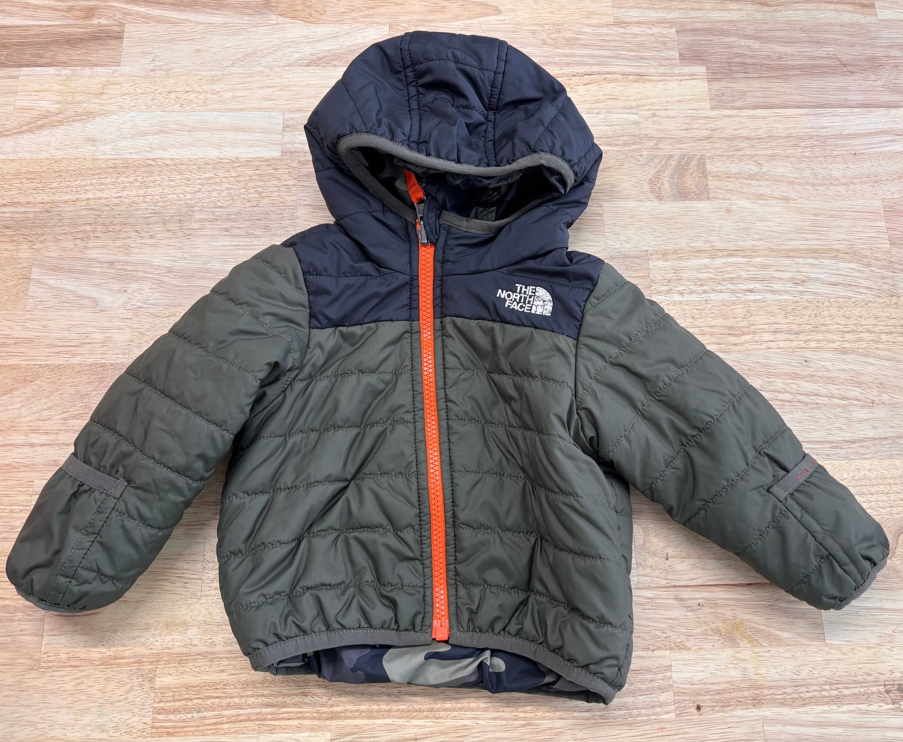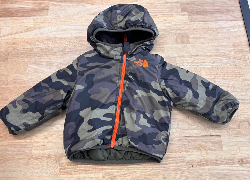 Reversible winter jacket from The North Face in camo and black, estimated size 6–12 months. Good used condition.