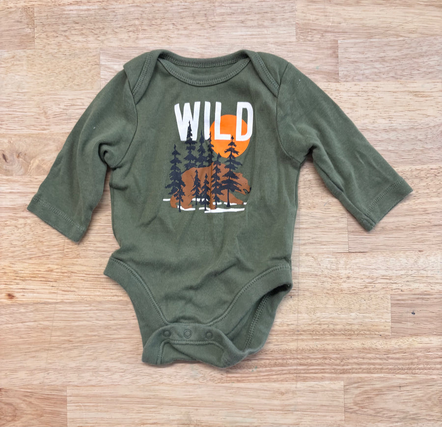 Old Navy 0-3 month green long sleeve bodysuit with “Wild” graphic. Good used condition.