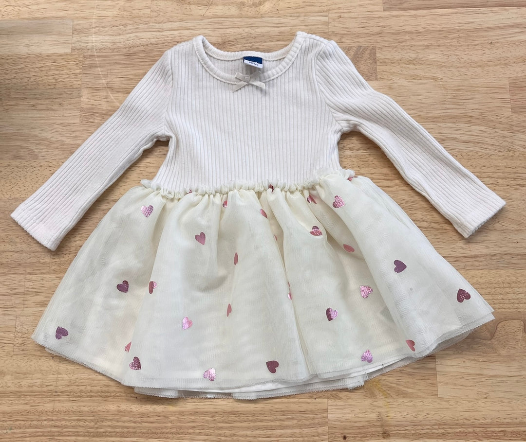Ribbed bodice dress with long sleeves and pink floral tulle skirt. Good used condition.