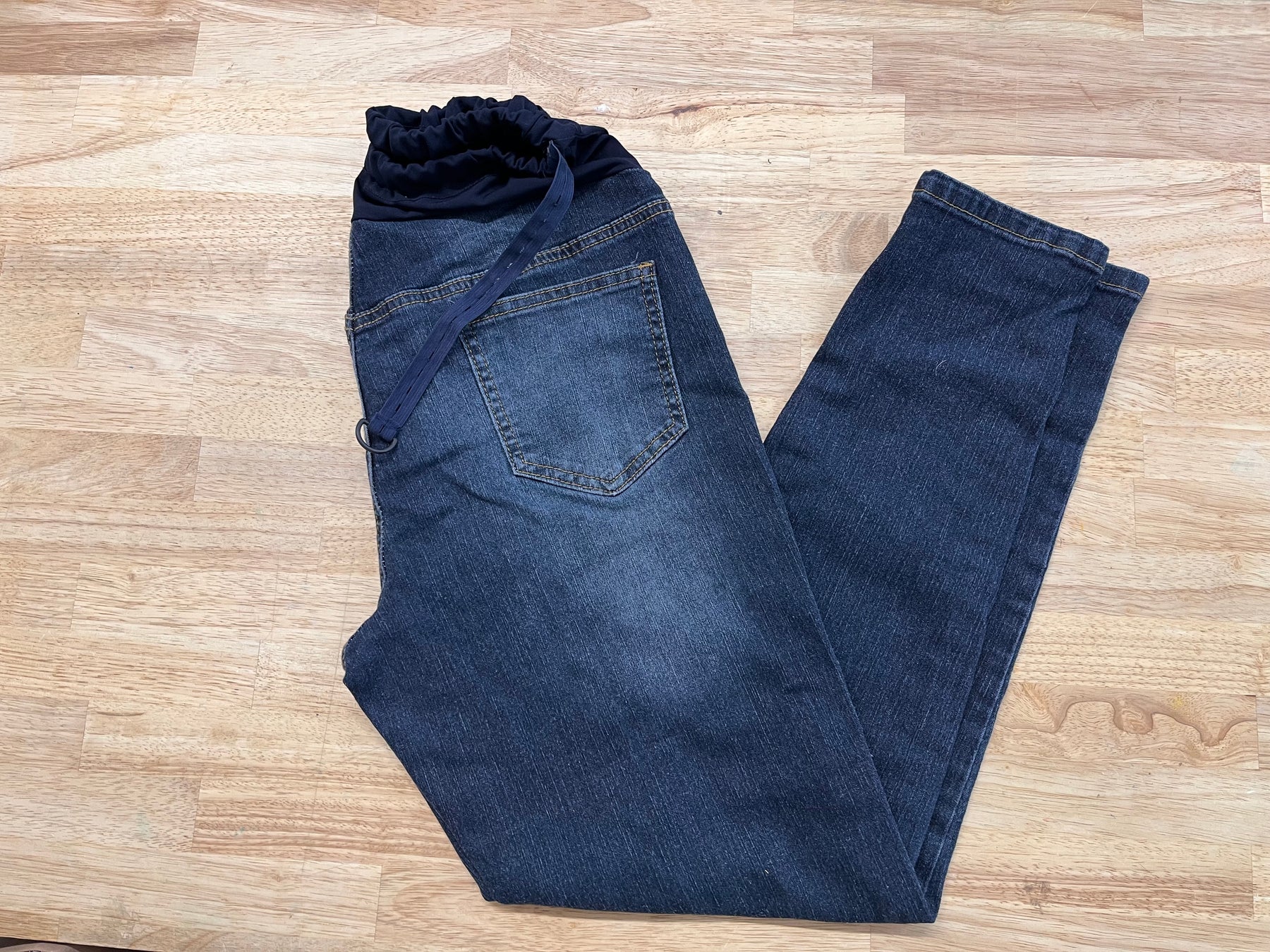 Light-medium denim wash maternity skinny jeans with adjustable belly panel. Good used condition.